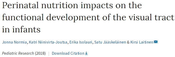 原文出处:Normia J, Niinivirta-Joutsa K, Isolauri E, et al. Perinatal nutrition impacts on the functional development of the visual tract in infants[J]. Pediatr Res. 2018 Sep 20. doi: 10.1038/s41390-018-0161-2.