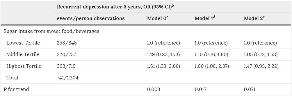 从甜食或饮料中摄入的糖分与5年后复发性抑郁的联系。Knüppel et al.