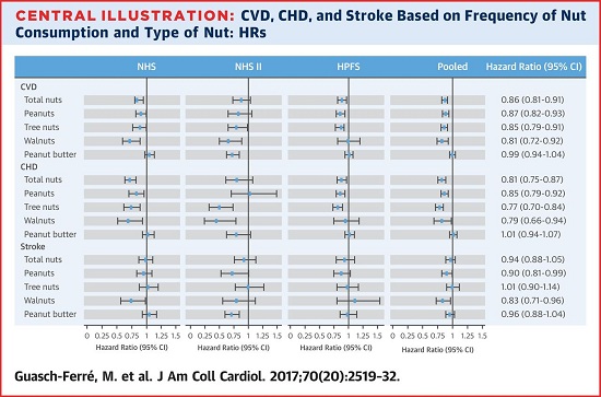 2017年11月14日,发表在《Journal of the American College of Cardiology》杂志上的一项研究称,与从不或几乎不吃坚果的人相比,经常吃坚果(包括花生、核桃和树坚果)的人患心血管疾病或冠心病的风险更低。这是迄今为止“调查吃坚果频率与心血管疾病关联”最大的一项研究。