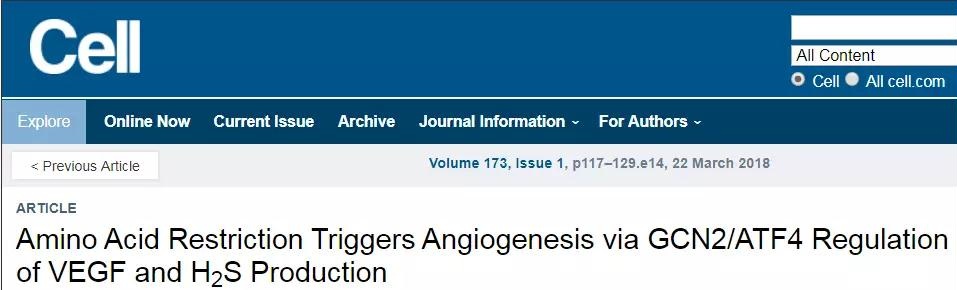 原文出处:Longchamp A, Mirabella T, Arduini A, MacArthur MR, Das A, Trevi?o-Villarreal JH, Hine C, Ben-Sahra I, Knudsen NH, Brace LE, Reynolds J, Mejia P, Tao M, Sharma G, Wang R, Corpataux JM, Haefliger JA, Ahn KH, Lee CH, Manning BD, Sinclair DA, Chen CS, Ozaki CK, Mitchell JR. Amino Acid Restriction Triggers Angiogenesis via GCN2/ATF4 Regulation of VEGF and H2S Production. Cell. 2018 Mar 22;173(1):117-129.e14. doi: 10.1016/j.cell.2018.03.001.