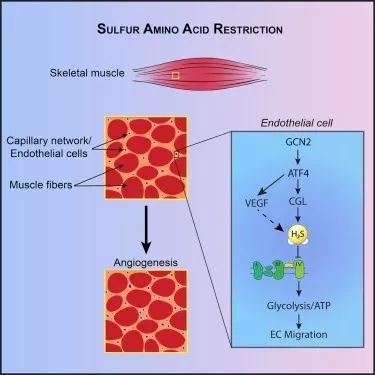 先前,Mitchell及其同事曾证实,Met限制饮食会增加硫化氢的产量。这一气味难闻的分子在我们的细胞中有很多有益的作用,其中就包括了促进新血管生长。在这项新研究中,他们给小鼠喂食了一种“含有限Met并缺乏Cys的饮食”。两个月后,与对照组小鼠相比,饮食限制组小鼠骨骼肌中的毛细血管数量增加了。