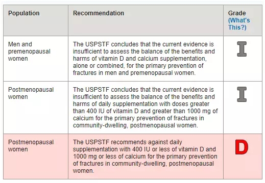 根据这些分析结果,USPSTF得出结论,口服维生素D和钙补剂并不能用于社区中的男性和绝经前妇女(除已患骨质疏松症、维生素D缺乏症的患者)骨折的一级预防。