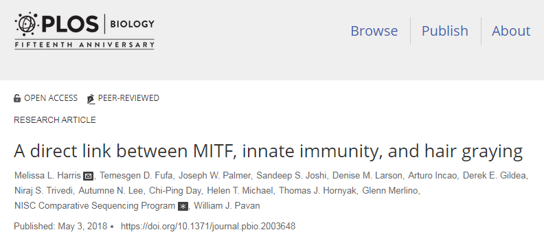 研究结果以题为“A direct link between MITF, innate immunity, and hair graying”发表在2018年5月3日《PLOS Biology》期刊上。研究人员揭示了负责头发颜色的基因和身体发病预警基因之间的联系。