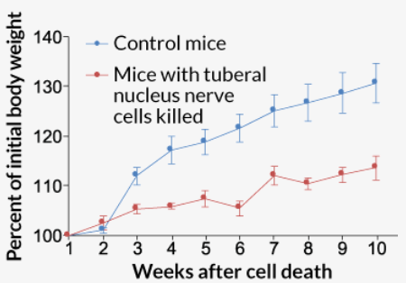 After newly discovered food-clamoring brain cells in a region called the tuberal nucleus are killed, mice gain less weight in the following weeks (red line) than mice that still have the cells (blue line). S.X. LUO ET AL/SCIENCE 2018