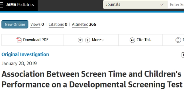 原文出处:Madigan S, Browne D, Racine N, et al. Association Between Screen Time and Children's Performance on a Developmental Screening Test[J]. JAMA Pediatr. 2019 Jan 28. doi: 10.1001/jamapediatrics.2018.5056.