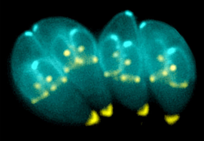 单细胞寄生虫在分裂过程中(图片来源:KE HU AND JOHN M. MURRAY/WIKIMEDIA COMMONSCC-BY 4.0)