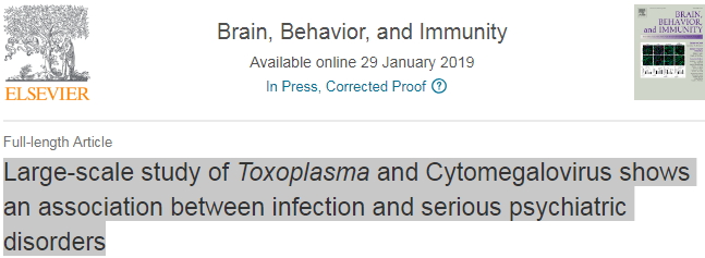 原文出处:Burgdorf KS, Trabjerg BB, Pedersen MG, et al. Large-scale study of Toxoplasma and Cytomegalovirus shows an association between infection and serious psychiatric disorders[J]. Brain Behav Immun. 2019 Jan 29. pii: S0889-1591(18)30699-8. doi: 10.1016/j.bbi.2019.01.026.