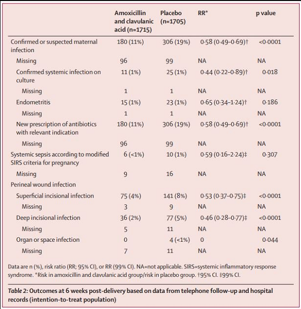 当然,作者也指出了这一研究的局限性,这包括1)主要结果中的感染诊断是经推测而非经过培养实验证实; 2)次要结果中接受随访调查的女性只有四分之三。这两种情况都可能影响结果。他们还指出,尽管给予了抗生素,但十分之一的女性仍有疑似或确诊的感染。这强调了更多研究调查作用机制的重要性,以及早期给药、产前给药或重复给药是否可能更有效。然而,口服预防性抗生素是否具有相同的预防功效尚未清楚。