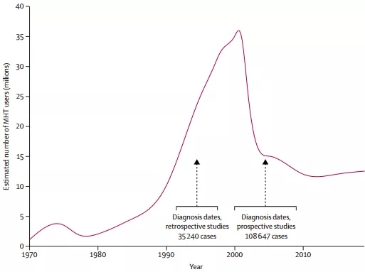 到了2010年,全球大约1200万更年期女性使用MHT,这一数字还在持续增加。而更年期这一段恰恰也是乳腺癌的高发期,大约3%的女性会在她们50多岁时患上乳腺癌[5]。