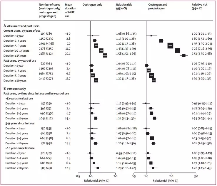 在现使用者中,不到1年的MHT几乎不会增加乳腺癌风险,而使用了1~4年的雌激素或雌激素+孕激素,分别与乳腺癌风险增加17%和60%相关,使用了5~14年的两种MHT,与之相关的风险更是分别增加了33%和108%。即使已经停用MHT的患者,与MHT持续时间相关的额外风险,依然可以持续存在10年以上。