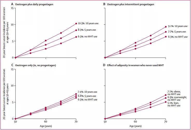 《柳叶刀》:更年期激素治疗别太久!57万人数据显示,激素替代时间越久,乳腺癌风险越高,身材苗条者尤甚,停药后影响仍可持续10年