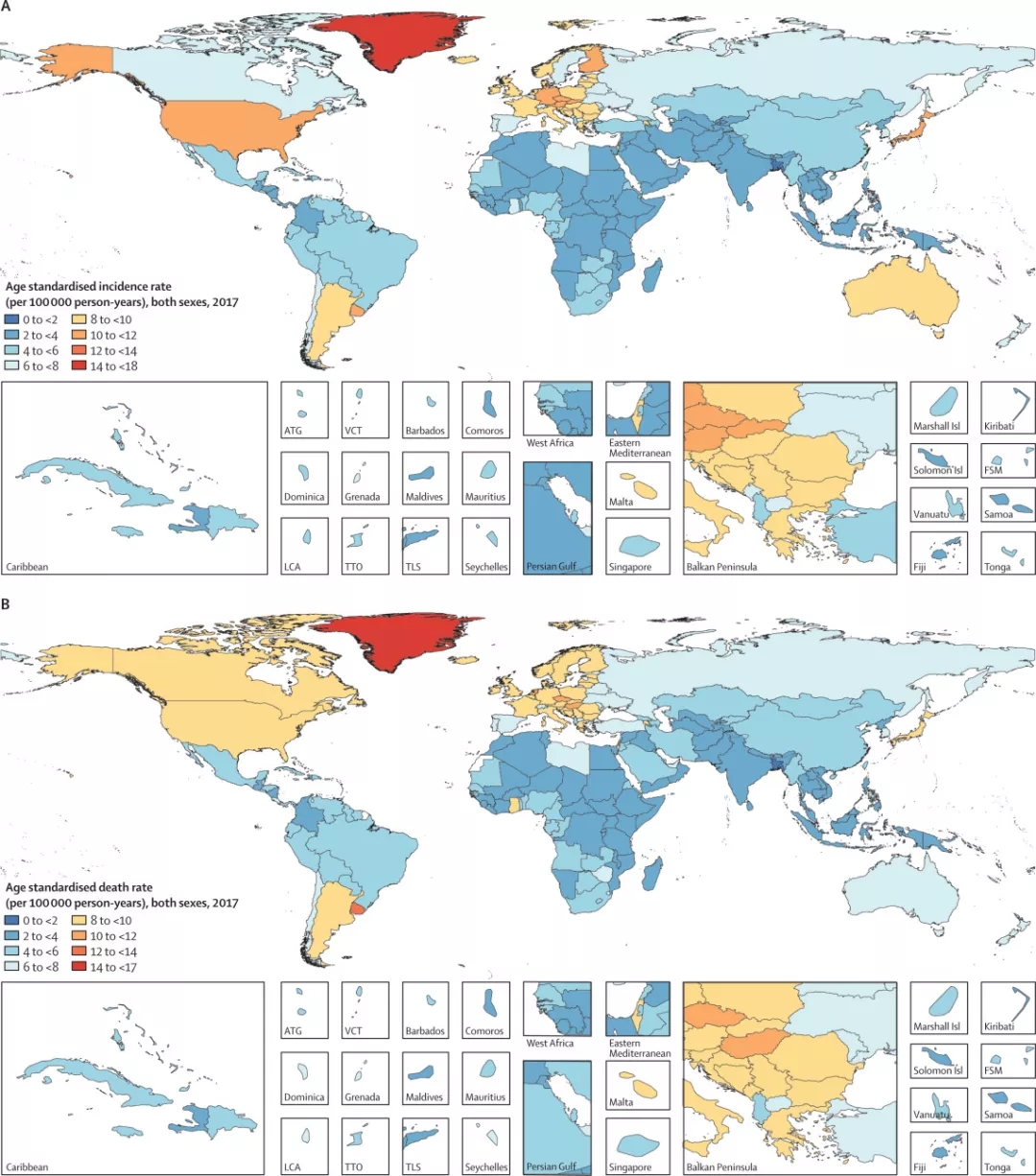 从 1990 年至 2017 年,胃癌的年龄标准化发病率和死亡率稳步下降。但是,这种下降并不一定带来高风险国家卫生系统的负担减轻,专家们认为,应根据每个国家的危险因素情况来制定特定的地区性策略。