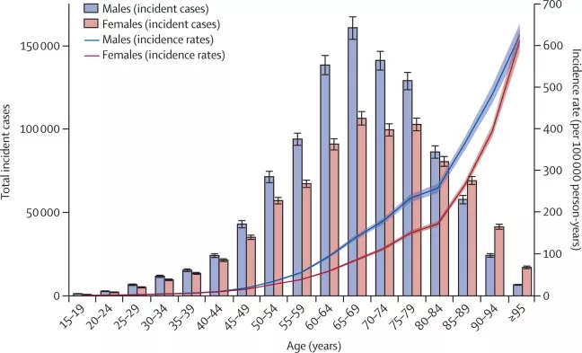▲2017年不同年龄、性别人群的全球结直肠癌发病数和每十万人发病率。蓝色代表男性,红色代表女性,柱状图代表发病数,折线图代表发病率(图片来源:参考资料[2])