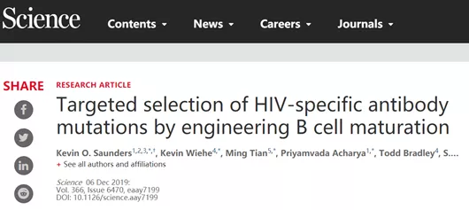 原文出处:Saunders KO, Wiehe K, Tian M, et al. Targeted selection of HIV-specific antibody mutations by engineering B cell maturation[J]. Science. 2019 Dec 6;366(6470). doi: 10.1126/science.aay7199.