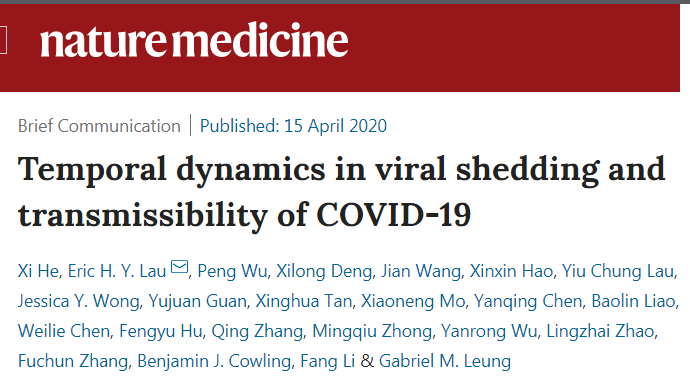 原文出处:He, X., Lau, E.H.Y., Wu, P. et al. Temporal dynamics in viral shedding and transmissibility of COVID-19[J]. Nat Med (2020). https://doi.org/10.1038/s41591-020-0869-5