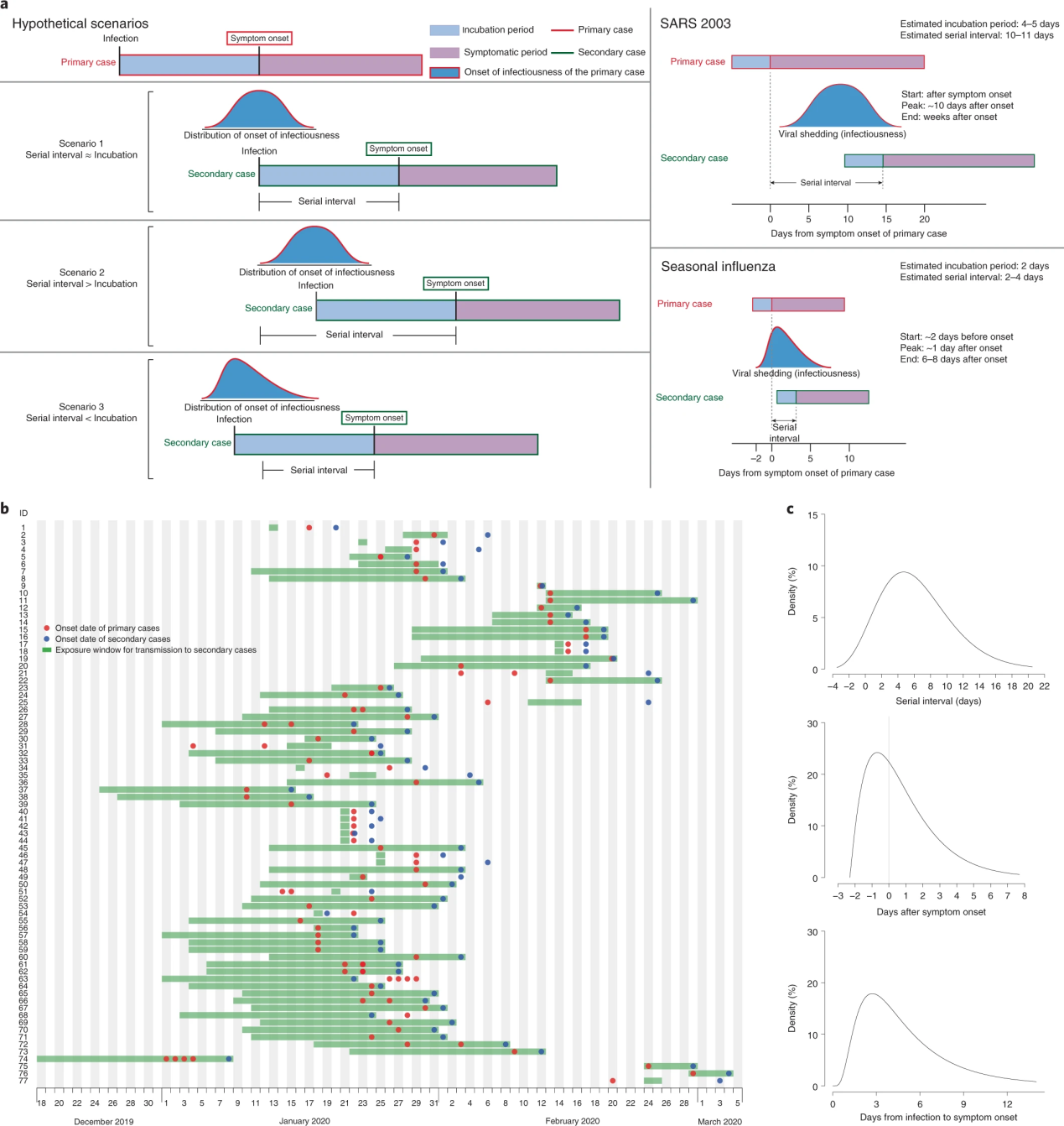 此外,研究人员还对来自公开数据的77个“传播对(传播者和受感染者)”的样本,以评估每位患者症状发作之间经过了多少时间。它假定潜伏期(从感染到出现症状的时间)中位数为5.2天。研究小组推断,传染性在症状出现之前的2.3天开始,并在出现症状前0.7天达到峰值。