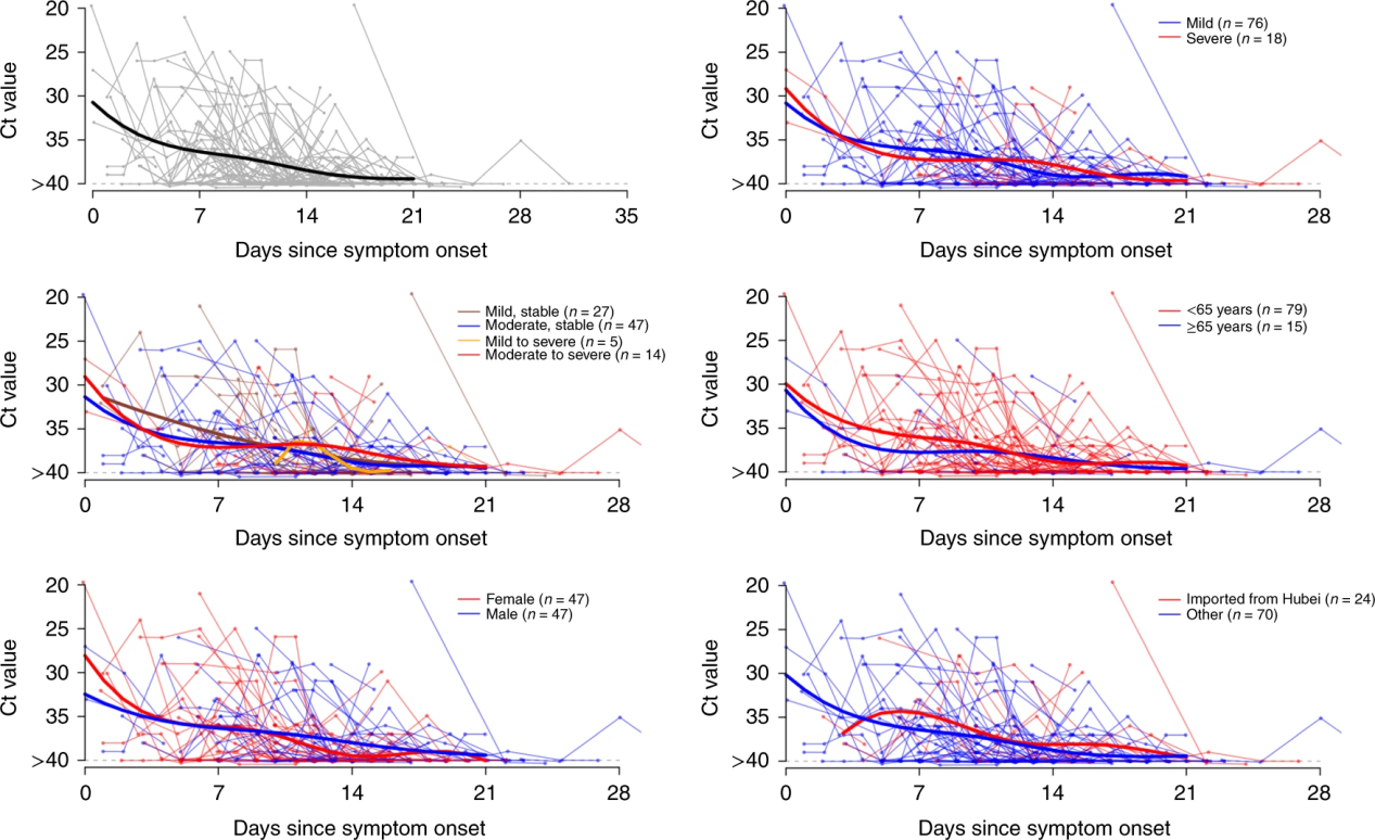结果显示,研究人员在患者出现症状后不久就检测到高病毒载量,然后在第21天左右逐渐下降至检测极限。不同性别,年龄组和疾病严重程度的病毒载量没有明显差异。