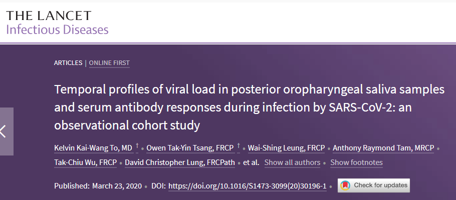 此外,柳叶刀发表的一项关于SARS-CoV-2感染期间深喉唾液中病毒载量的时间变化和血清抗体反应的观察性队列研究。研究发现,新冠肺炎患者发病第一周深喉唾液病毒载量最高,随后逐渐下降。