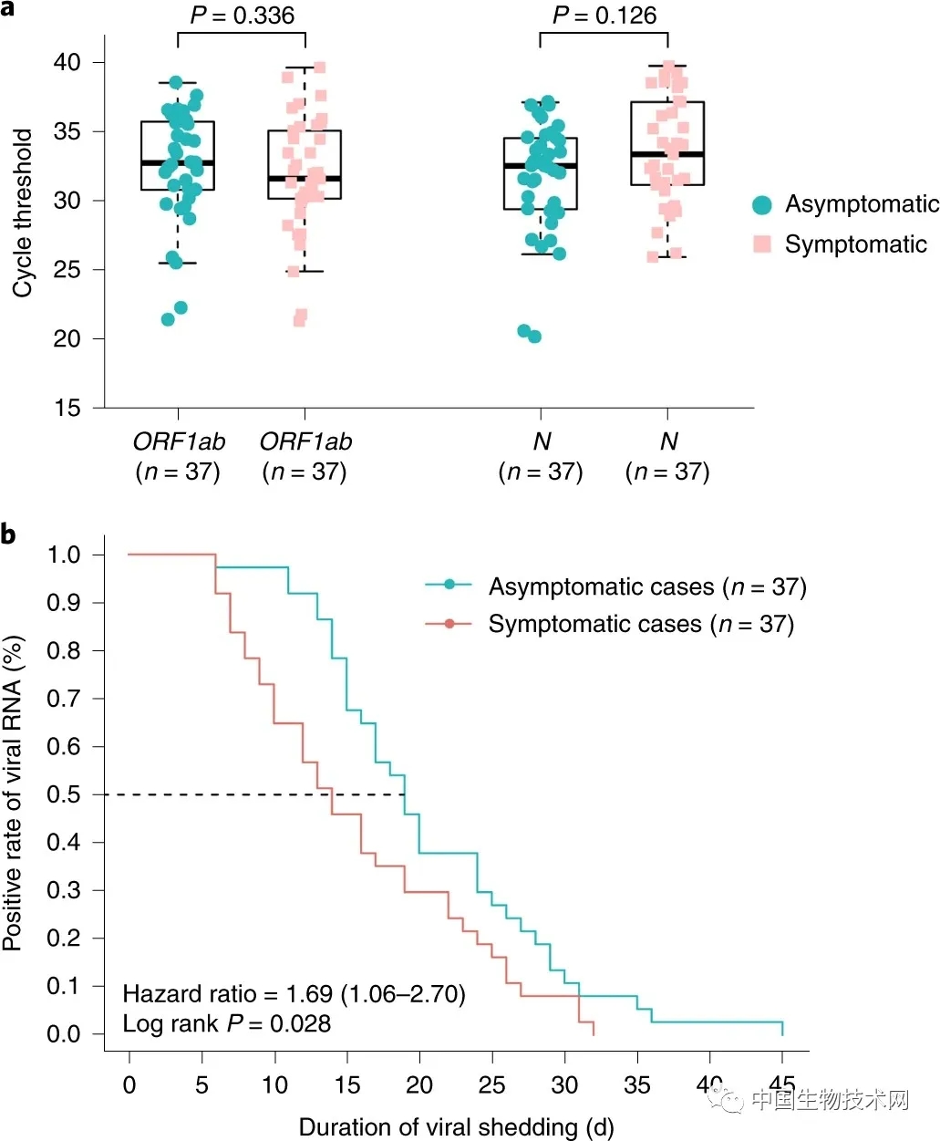 在无症状组中,病毒脱落的中位持续时间为19 天;有症状患者为14天。无症状组的病毒脱落持续时间明显长于有症状组。但研究人员表示,可测量的病毒脱落并不等同于病毒的感染性,需要进一步评估。