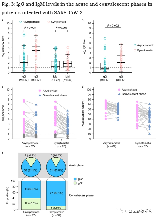 研究人员还追踪了37名无症状患者和有症状患者进入早期恢复期(出院后8周)的情况。无症状组中81.1%(30/37)显示中和抗体水平下降,而在有症状组中,62.2%(23/37)中和抗体水平下降。