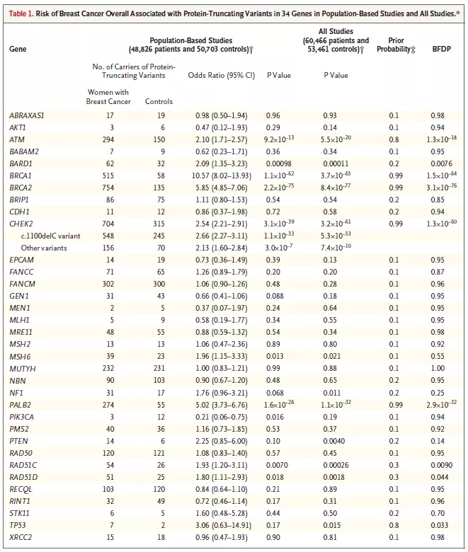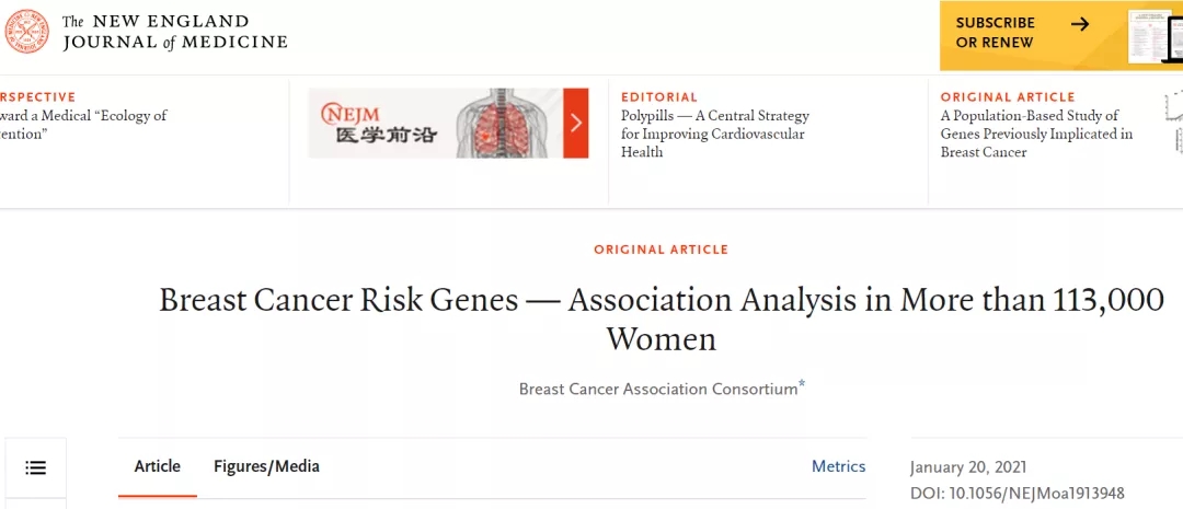 原文出处:Breast Cancer Association Consortium, Dorling L, Carvalho S, Allen J, et al. Breast Cancer Risk Genes - Association Analysis in More than 113,000 Women[J]. N Engl J Med. 2021 Jan 20. doi: 10.1056/NEJMoa1913948. Epub ahead of print. PMID: 33471991.