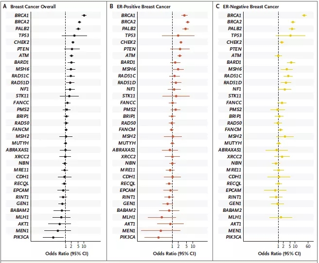 近一步分析发现,与乳腺癌风险增加明显相关的12个基因中,ATM和CHEK2与雌激素受体(ER)阳性乳腺癌的关联性比ER阴性乳腺癌更强,其优势比分别为2.33和2.67。CHEK2也与非三阴性乳腺癌相关,优势比为2.53,但与三阴性乳腺癌无显著关联。