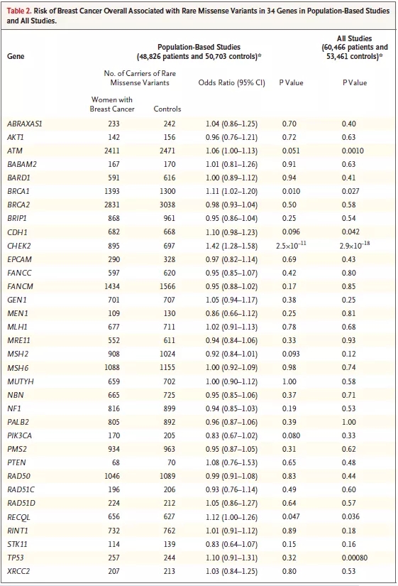 研究人员选取了44项BCAC(乳腺癌协会联盟)研究中的53461名未患病对照和60466名乳腺癌(浸润性肿瘤占比90.3%,原位肿瘤6.9%,浸润性未知肿瘤2.7%)妇女的DNA样本,进行34个假定易感基因的蛋白截短突变和罕见错义突变分析,并评估了其与总体乳腺癌和肿瘤亚型的患病风险的相关性。