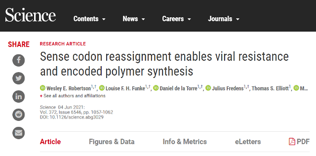 该研究以“Sense codon reassignment enables viral resistance and encoded polymer synthesis”为题,发表在最新一期的 Science 杂志上。