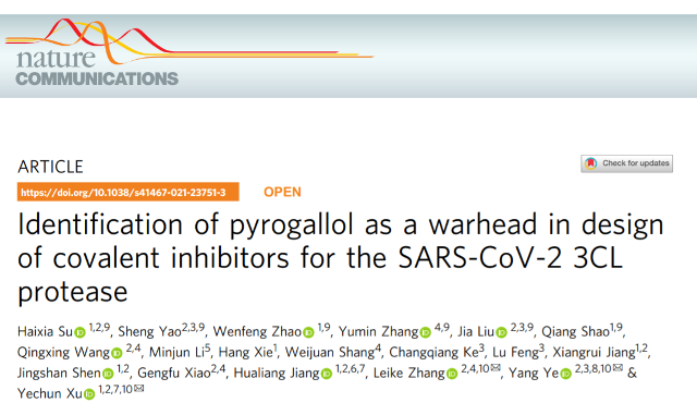 原文出处:Su, H., Yao, S., Zhao, W. et al. Identification of pyrogallol as a warhead in design of covalent inhibitors for the SARS-CoV-2 3CL protease. Nat Commun 12, 3623 (2021). https://doi.org/10.1038/s41467-021-23751-3
