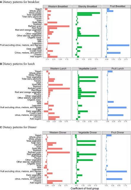 三顿正餐的摄入食物种类和占比,也可以做这么一张分布图出来,这样可以让研究者细化分析参与者在不同时段,吃不同种类食物对健康和疾病风险的影响。