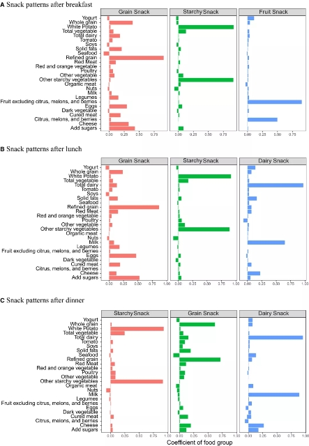 下面这张图就反映了早餐、午餐和晚餐后,参与者们食用的零食种类和具体占比。而且NHANES调查的数据比较细致,参与者报告的一日三顿正餐,也可以分成水果类、蔬菜类、淀粉类以及西式餐食(加工肉类、精制谷物、奶酪为主)。