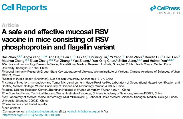原文出处:Zhao B, Yang J, He B, et al. A safe and effective mucosal RSV vaccine in mice consisting of RSV phosphoprotein and flagellin variant. Cell Rep. 2021 Jul 20;36(3):109401. doi: 10.1016/j.celrep.2021.109401. PMID: 34289371.