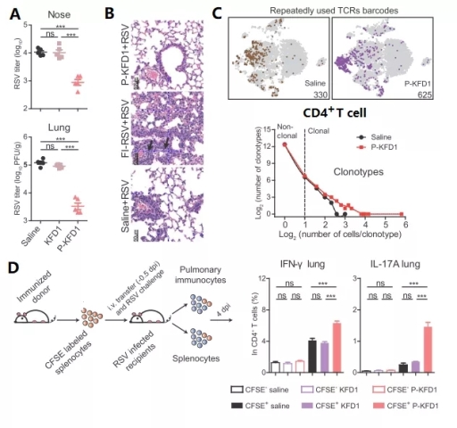 研究发现,P-KFD1鼻内免疫小鼠可同时大幅减少RSV在上呼吸道和下呼吸道的复制 (图1A),并且不会造成VED(图1B)。P-KFD1通过鼻内免疫诱导产生了P特异性CD4+ T细胞应答,并发挥关键的抗病毒作用(图1C)。在这些CD4+T细胞中,肺黏膜局部的记忆性T细胞(Trm)和招募到呼吸道的T细胞协同发挥了抗病毒作用(图1D)。单细胞测序发现,P-KFD1鼻内免疫诱导产生了特异性Th17细胞群(图1C);细胞过继实验进一步验证了这种P特异性、而且平衡的Th1/Th17应答(图1D)在发挥抗病毒作用的同时,避免了病理损伤。