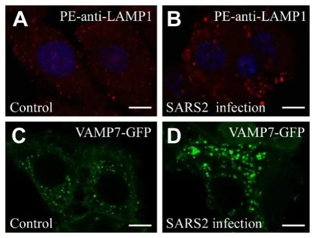图3. 新冠病毒感染细胞中溶酶体外泌增强,VAMP7形成的点状结构增加