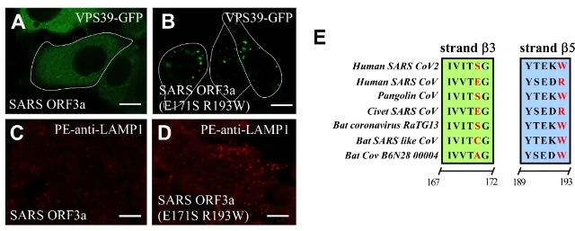 图4. 非典病毒ORF3a(E171S R193W)突变体能够招募VPS39以及促进溶酶体外泌