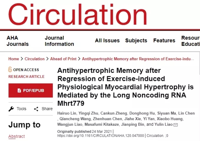 原文出处:Lin H, Zhu Y, Zheng C, Hu D, Ma S, Chen L, Wang Q, Chen Z, Xie J, Yan Y, Huang X, Liao W, Kitakaze M, Bin J, Liao Y. Antihypertrophic Memory After Regression of Exercise-Induced Physiological Myocardial Hypertrophy Is Mediated by the Long Noncoding RNA Mhrt779. Circulation. 2021 Jun 8;143(23):2277-2292. doi: 10.1161/CIRCULATIONAHA.120.047000. Epub 2021 Mar 24. PMID: 33757294; PMCID: PMC8177494.