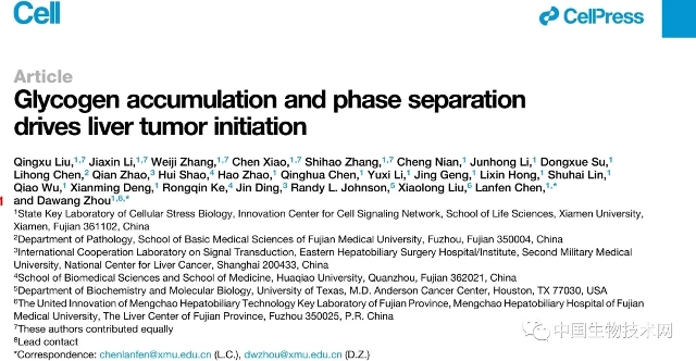 原文出处:Liu Q, Li J, Zhang W, Xiao C, Zhang S, Nian C, Li J, Su D, Chen L, Zhao Q, Shao H, Zhao H, Chen Q, Li Y, Geng J, Hong L, Lin S, Wu Q, Deng X, Ke R, Ding J, Johnson RL, Liu X, Chen L, Zhou D. Glycogen accumulation and phase separation drives liver tumor initiation. Cell. 2021 Oct 18:S0092-8674(21)01175-2. doi: 10.1016/j.cell.2021.10.001. Epub ahead of print. PMID: 34678143.