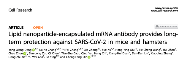 5 Deng, Y.-Q. et al. Lipid nanoparticle-encapsulated mRNA antibody provides long-term protection against SARS-CoV-2 in mice and hamsters. Cell Research, doi:10.1038/s41422-022-00630-0 (2022).