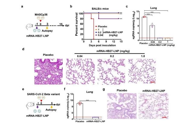 利用新冠病毒鼠适应株MASCp36的攻毒模型8,研究人员进一步评估了预防给药该mRNA抗体(mRNA-HB27-LNP)的保护作用。结果发现不同剂量mRNA-HB27-LNP给药均显示出明显保护效果。其中1和0.2 mg/kg剂量可完全清除病毒,所有给药小鼠全部存活;低至0.04 mg/kg剂量给药也可保护80%小鼠,小鼠肺部病理仅出现轻微损伤(图2)。使用新冠病毒贝塔变异株(南非株)攻毒模型9同样发现,mRNA抗体具有完全的预防效果,完全清除了小鼠肺部的病毒载量,所有给药小鼠肺部均未观察到明显的肺损伤。