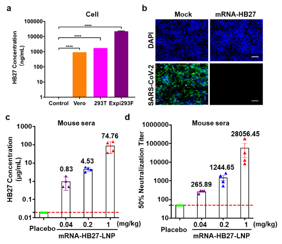 前期工作中,秦成峰联合团队成功开发了一款新冠病毒高效中和抗体HB27,该抗体对新冠病毒多个变异株中和效价均在纳摩水平,并能够通过独特的双重锁定机制在病毒受体结合和膜融合不同阶段发挥抗病毒作用6。本研究中,研究人员首先构建了编码HB27重链和轻链的两个mRNA分子(称为mRNA-HB27),一系列生化试验表明,mRNA-HB27可在细胞水平高效表达具有生物活性的HB27抗体(图1)。利用前期建立的成熟的mRNA-LNP工艺7,研究人员进一步制备了包裹上述两种mRNA分子的LNP制剂(命名为mRNA-HB27-LNP)。小鼠试验结果表明,静脉单次给药mRNA-HB27-LNP,可在体内迅速产生具有中和作用的HB27抗体。