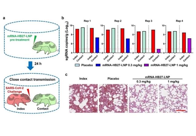 更重要的是,利用仓鼠的密切接触传播模型研究10发现,mRNA抗体可有效抑制新冠病毒的传播和发病。提前1天给药不同剂量mRNA-HB27-LNP,均可有效降低仓鼠肺部病毒载量,所有给药动物肺部未观察到明显的组织病理损伤(图3)。这些结果表明,mRNA抗体在阻断传播和发病方面可以发挥重要作用。
