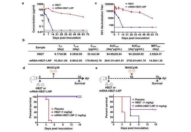进一步,研究人员系统比较了mRNA抗体和传统蛋白抗体的药代动力学特征。结果发现,mRNA抗体的平均停留时间(MRT)和半衰期(t1/2)显著优于传统的蛋白抗体。即使在给药后63天,mRNA抗体的血清抗体浓度仍保持在4.95 μg/mL,这远远超出HB27抗体在体外的中和效价(1.47 ng/mL)。为此,我们又进一步研究了mRNA抗体的长期保护效果。结果发现,mRNA抗体即使在给药后63天,仍能保护50%的小鼠免于死亡,而蛋白抗体组或安慰剂组小鼠均在9天内全部死亡(图4)。这些结果表明,mRNA抗体具有长效保护的显著特点。