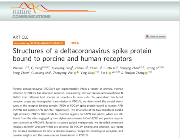 2022年3月18日,国际著名学术期刊《Nature Communications》在线发表了题为:Structures of a deltacoronavirus spike protein bound to porcine and human receptors(猪德尔塔冠状病毒刺突蛋白与人和猪受体复合物的结构)的研究论文,报道了南京农业大学生命科学学院张水军教授与江苏省农业科学院兽医研究所李彬研究员团队合作在猪德尔塔冠状病毒(PDCoV)跨物种传播方面的重要研究成果。
