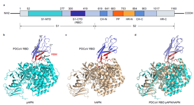 图1 PDCoV RBD与人和猪的APN复合物晶体结构示意图