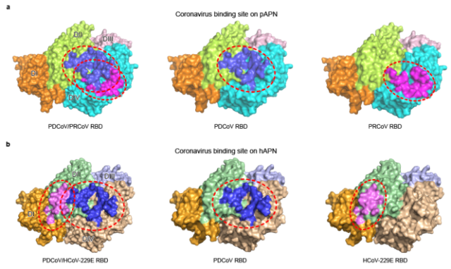 该研究团队解析了PDCoV的刺突蛋白(S蛋白)受体结合区(RBD)与人和猪的细胞受体氨基肽酶N(APN)的复合物晶体结构,揭示PDCoV结合两个物种的受体上保守氨基酸位点,且发现PDCoV的RBD在人和猪APN上具有高度相似的结合区域(图1),可能是其感染猪和人的结构基础。但该结合区域与人冠状病毒HCoV-229E、猪呼吸道冠状病毒(PRCoV)与受体APN的结合区域完全不同(图2)。