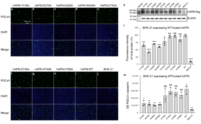 结合体外生化和病毒感染实验发现(图3),研究团队进一步鉴定了APN受体上影响PDCoV实现跨物种传播的关键氨基酸位点(Y316、K379、E426和W429)。该论文揭示了猪德尔塔冠状病毒跨物种传播的可能机制,为研制该病毒的疫苗和药物提供了结构基础和理论依据。
