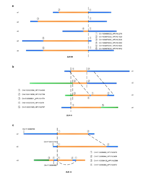 通过分析基因组上的克隆整合事件,研究团队首次发现多个不同HPV整合事件存在共同断点(图2),提示这些整合事件是进化相关的,HPV整合可能是导致宫颈癌肿瘤内异质性的原因之一。而且,该整合特征分析很好地吻合了预后数据,预示着其有望成为一个新的有效的预后指标。研究团队还揭示了HPV能够介导人类异染色体间的易位,在这些易位事件中,HPV充当一个链接器(linker),其两端分别与两条不同的人类染色体融合,从而导致HPV整合对人类基因组产生更大范围更复杂的影响(图2)。