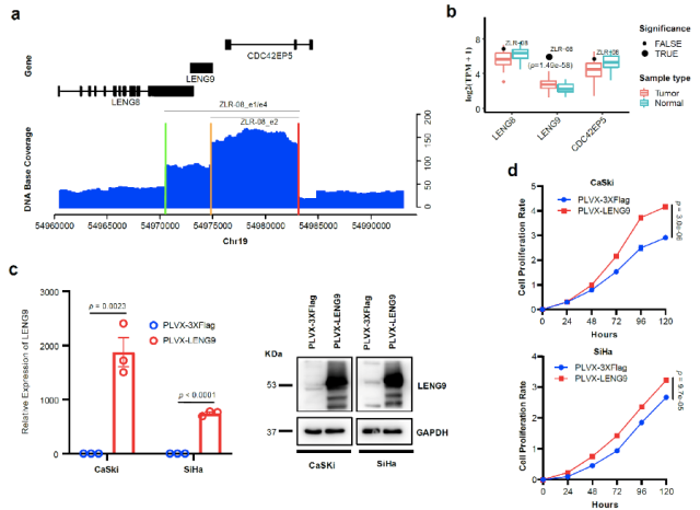 此外,结合相应的RNA-seq数据,研究团队发现了三个新的宫颈癌致癌候选基因(LINC00290, LINC02500和LENG9)及其可能的致癌机制。其中,LENG9基因片段因为和HPV形成eccDNA结构而大量扩增,相应的表达水平也大幅上调;细胞学实验亦证实了该基因高表达能显著促进细胞增殖、迁移和侵袭(图4)。
