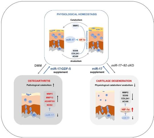 该研究发现了骨关节炎新的发病机制,报道了微小RNA-17(miR-17)通过抑制缺氧诱导因子HIF-1α和多种基质降解酶,发挥了维持关节软骨生理性更新以及抑制骨关节炎软骨破坏的双重作用,确定了miR-17是骨关节炎诊断、预防和治疗的重要靶点。