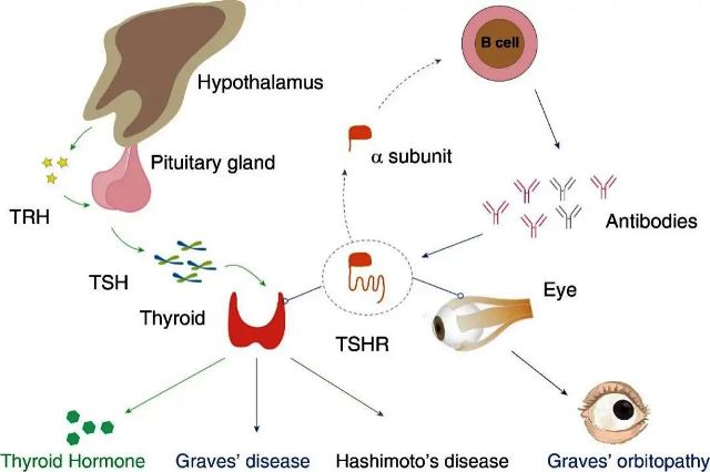 近年来,甲状腺相关疾病的发病率正逐年上升,我国甲状腺相关疾病的总患病率高达20%。甲状腺相关疾病主要包括甲状腺功能亢进(甲亢)、甲状腺功能减退(甲减)、甲状腺结节,以及甲状腺癌。甲状腺的主要生理功能是分泌甲状腺素调控机体能量代谢,而这一功能的实现依赖于甲状腺细胞表面的促甲状腺素受体(TSHR)感知垂体细胞分泌的促甲状腺激素(TSH)信号。临床研究发现,弥漫性毒性甲状腺肿(又称Graves’ disease, GD)是甲状腺功能亢进的主要疾病表型,GD属于自身免疫性疾病,在人群中的总发病率约为1%,且女性的发病率远高于男性,其发病机理是机体免疫系统产生了能够特异性识别TSHR的激活型抗体,甲状腺细胞表面的TSHR受到抗体持续激活进而引起甲状腺分泌过多的甲状腺素引发疾病。与此同时,激活型抗体也会激活表达在眼眶成纤维细胞膜上的TSHR,从而导致成纤维细胞的过度增殖和分化,导致眼睛肌肉肿胀,引发格氏眼病(Graves’ orbitopathy,GO),患有GD的患者近半数也会同时患上格氏眼病。此外,临床也存在部分甲减患者,其疾病类型为自身免疫性桥本病(又称Hashimoto’s disease),Hashimoto’s disease的患者中,一部分是由于免疫系统产生了靶向TSHR的抑制性抗体所致。因此,TSHR在介导甲状腺发挥正常的生理功能外,也参与了甲状腺相关疾病的发生发展(如图1)。